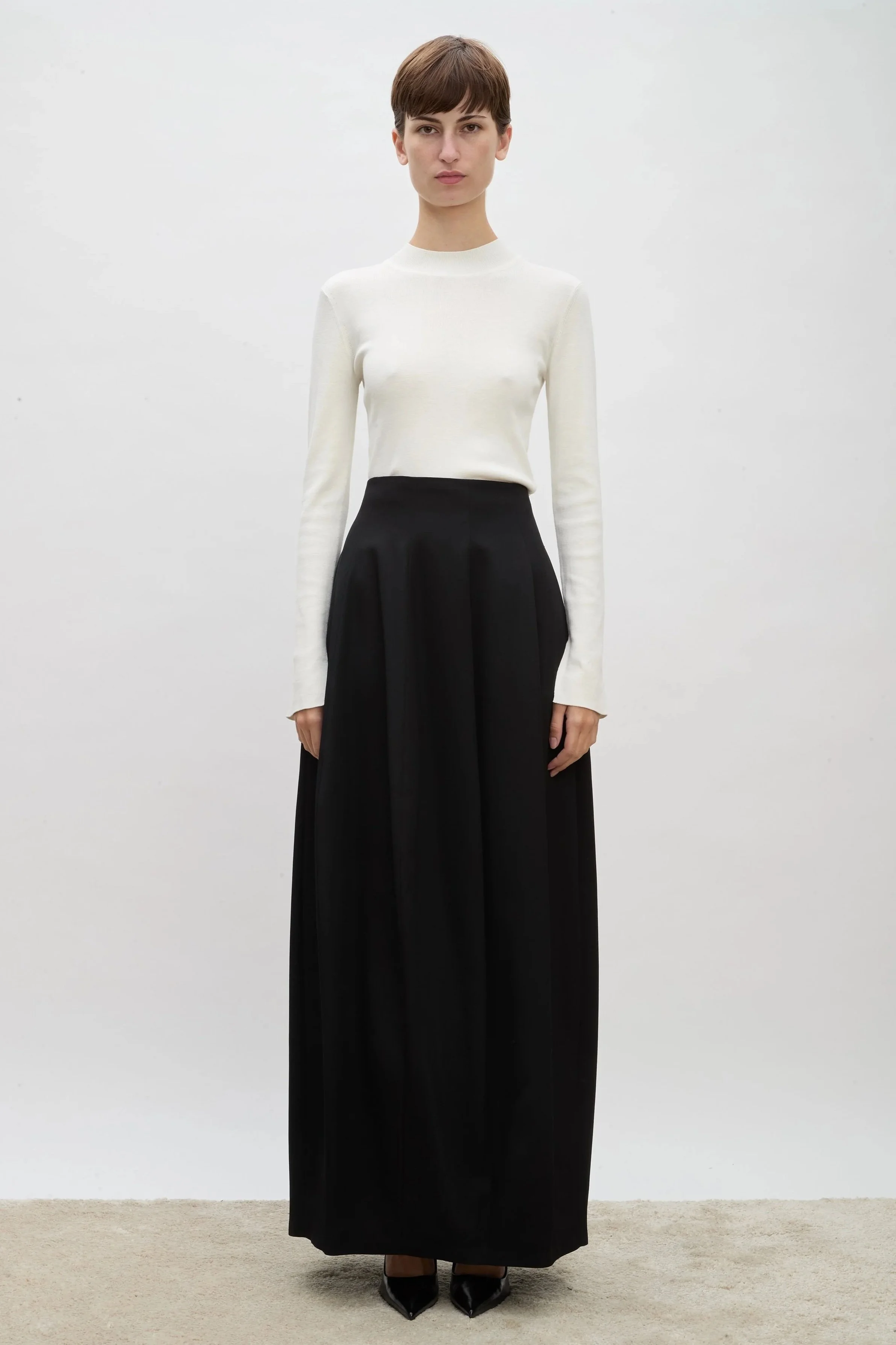 Sculpted in panels of structured Japanese denim, the Lulu Mini Skirt has a straight, mini-length silhouette with a playful flare and raw-edge hem.