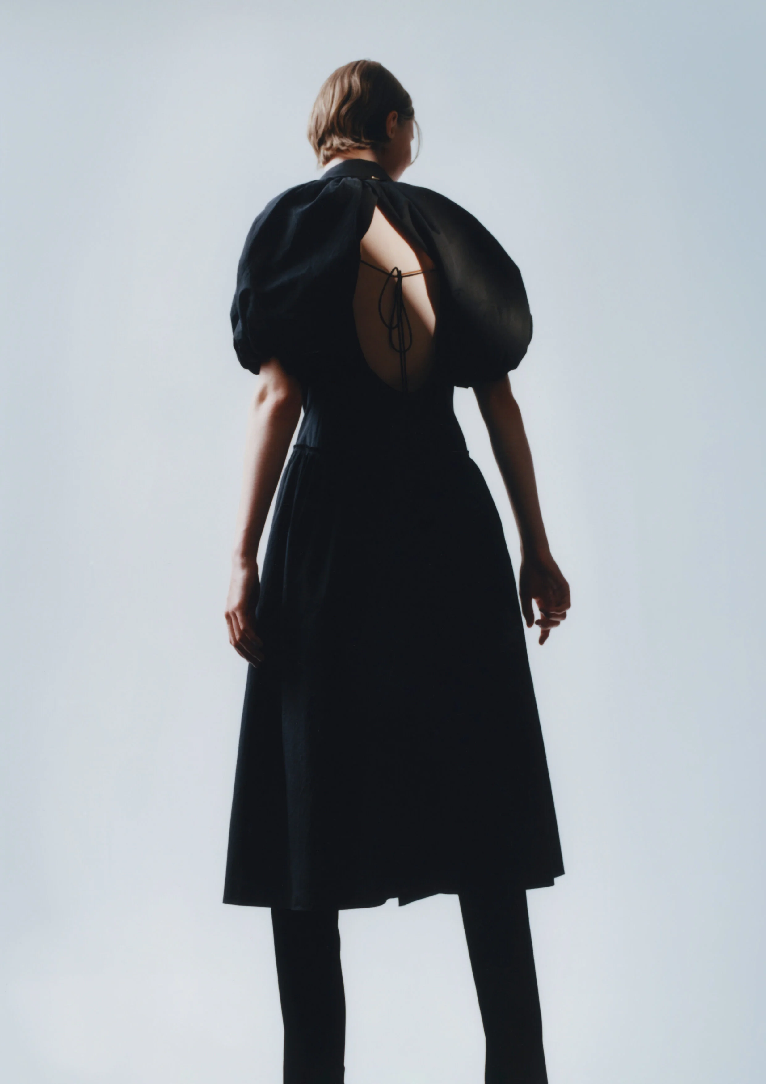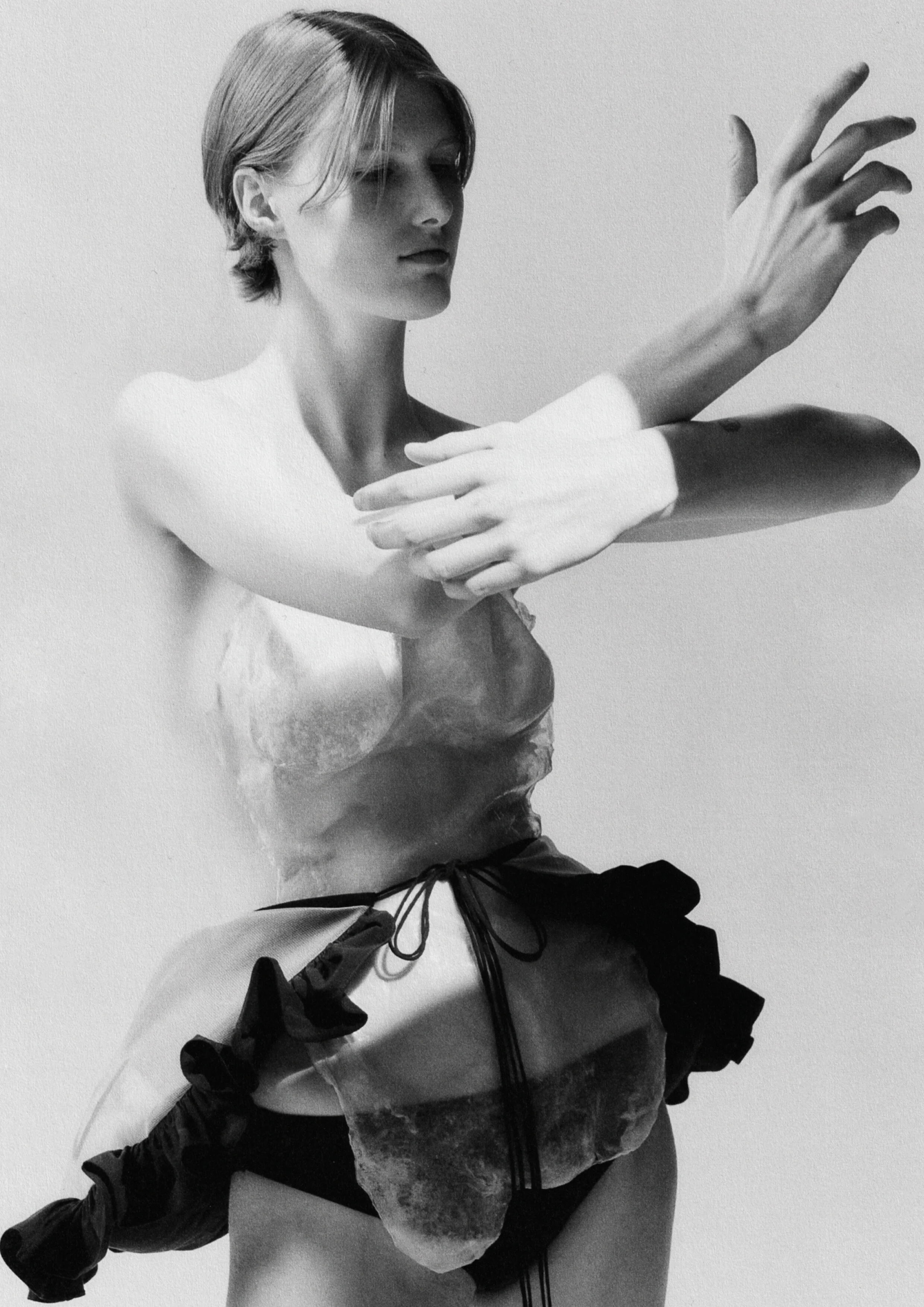 On the streets of the Garment District, the castoffs of creation are laid bare. Trash bins overflow with scraps and selvage, remnants discarded. For SS22, Park repurposes the minimal scraps that are produced into padding for transparent dumpling shaped bustles, which are offered to create volume at the hip.